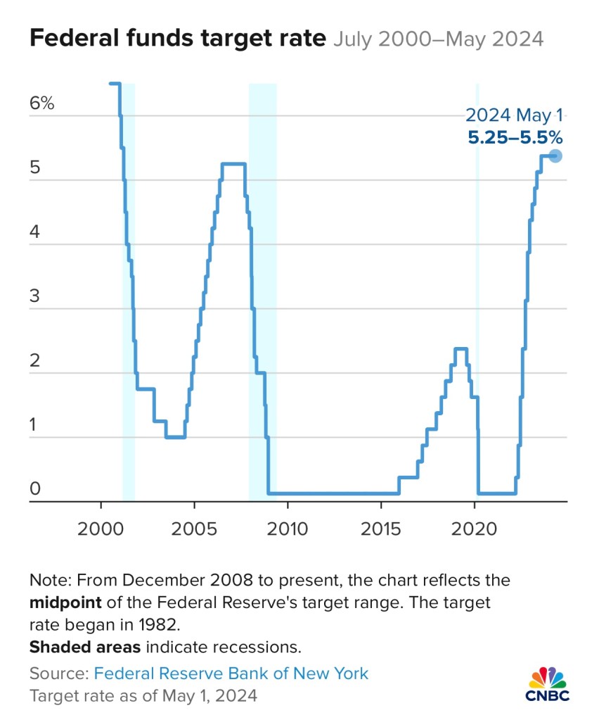 投资业内有句约定俗成的金科玉律:”Don’t Fight the Fed.” 因此美联储的一举一动都令人瞩目。最近的议息会议刚刚结束,美联储决定维持基准利率不变,在 5.25% – 5.5% 的区间。这是近23年以来的最高水平。美联储指出目前在将核心个人消费支出价格指数 – the core PCE – 降至 2% 的目标方面 “缺乏进一步进展”。美联储主席鲍威尔明确表示加息是 “不太可能” 的。